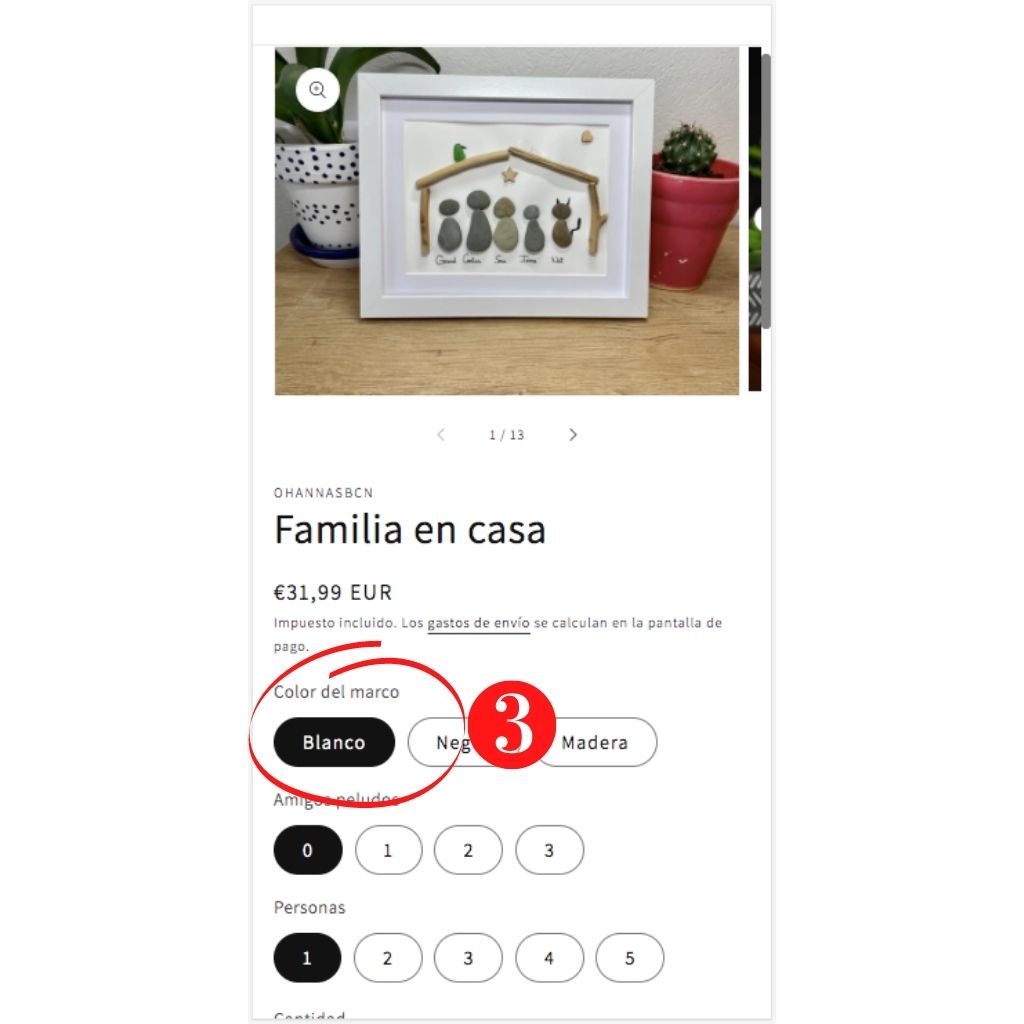 Justo debajo del diseño vas a tener diferentes variantes en función del retrato. En general vas a tener que escoger, el color del marco, el número de amigos peludos y el número de miembros de la familia (personas)